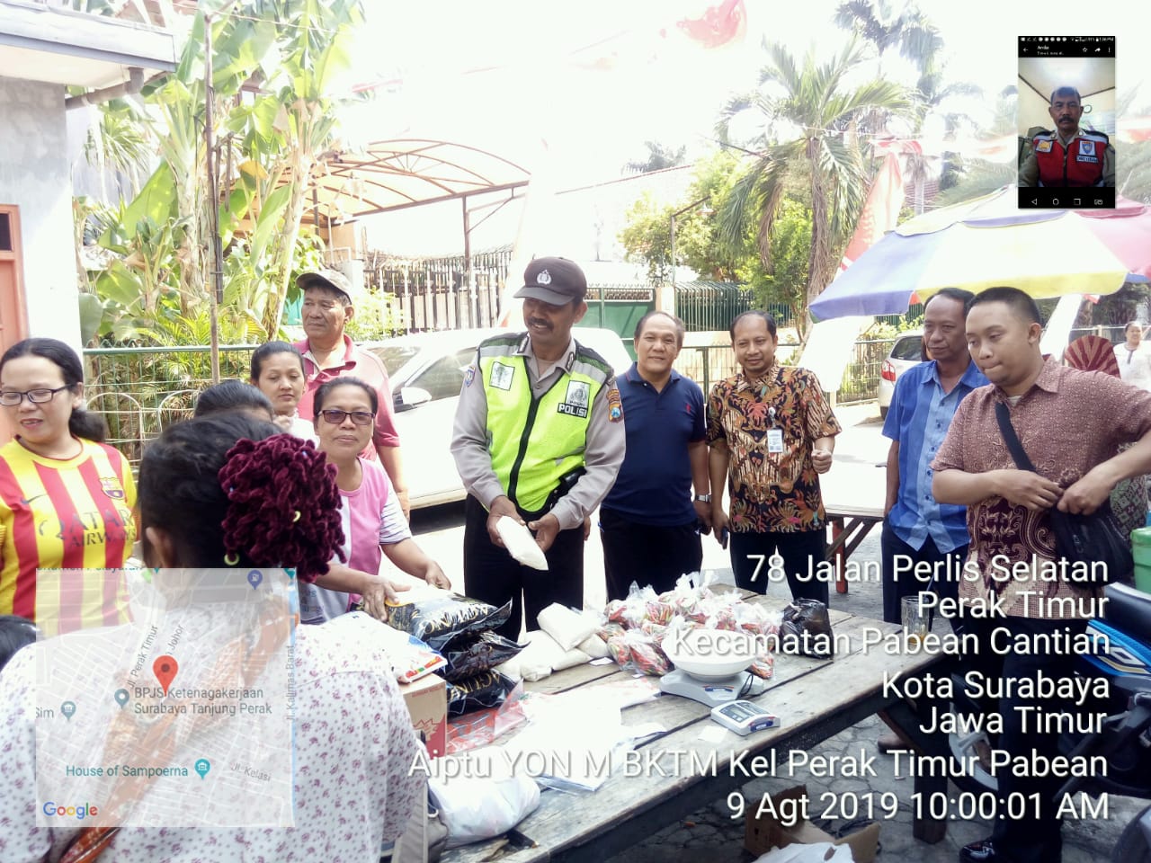 Seputarperak.com- Pengamanan pasar murah dilakukan Aiptu Marijono, Babinkamtibmas Perak Timur, Polsek Pabean Cantikan, Polres Pelabuhan Tanjung Perak di Jalan Perlis Selatan, Jumat pagi, 9 Agustus 2019.