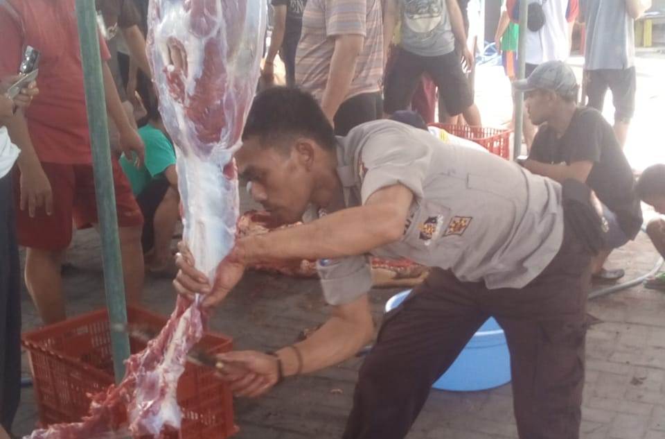 Dalam kegiatan tersebut Bripka Busaryanto ikut turun tangan membantu melakukan pemotongan daging hewan kurban yang sebelumnya telah disembelih.