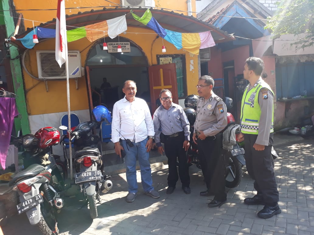 Seputarperak.com- Pengamanan kebaktian di rumah ibadah GKI Siloam, Jalan Simorejosari, Minggu pagi, 18 Agustus 2019 dilakukan Polsek Asemrowo, Polres Pelabuhan Tanjung Perak.