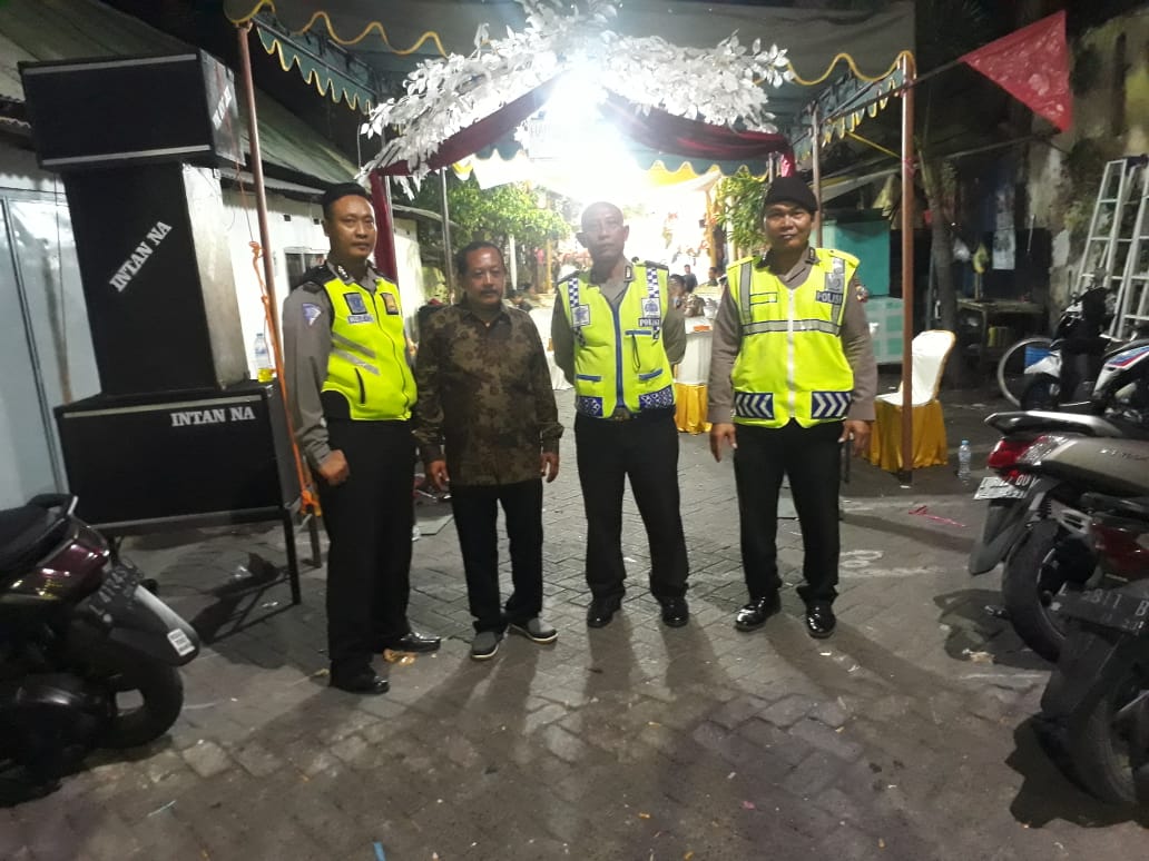 Seputarperak.com- Pengamanan acara hajatan resepsi pernikahan dilakukan personil Polsek Pabean Cantikan, Polres Pelabuhan Tanjung Perak di seputaran Jalan Banteng, Minggu malam, 18 Agustus 2019.