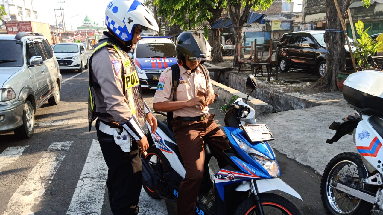 Salah satunya seperti yang dilakukan personil Satlantas Polres Pelabuhan Tanjung Perak terhadap anak sekolah yang sedang mengendarai sepeda motor.