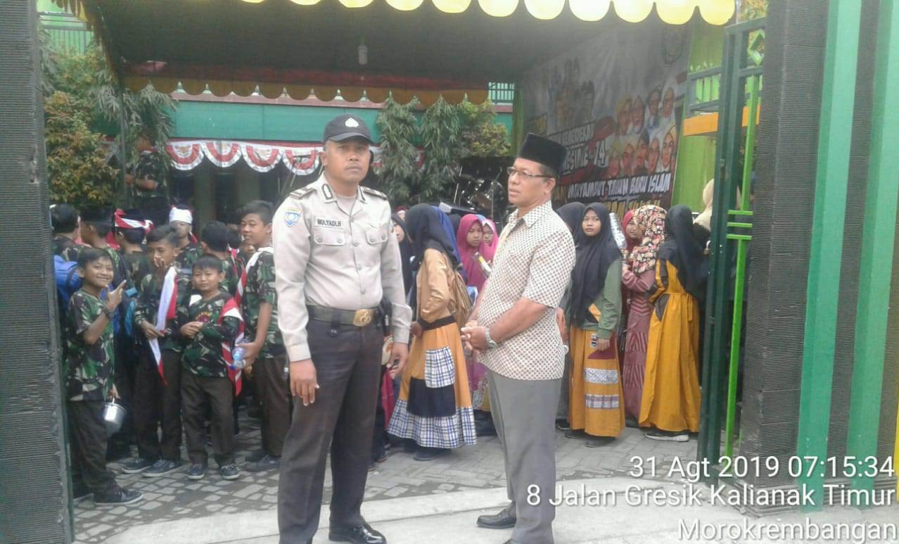 Seputarperak.com- Pengamanan acara karnaval memperingati HUT ke 74 RI dan 1 Muharram 1441 H dilaksanakan Aiptu Mulyadi Herwoyo, Babinkamtibmas Morokrembangan, Polsek Krembangan, Polres Pelabuhan Tanjung Perak di MTS Wahid Hasyim, Kalianak, Sabtu pagi, 31 Agustus 2019.