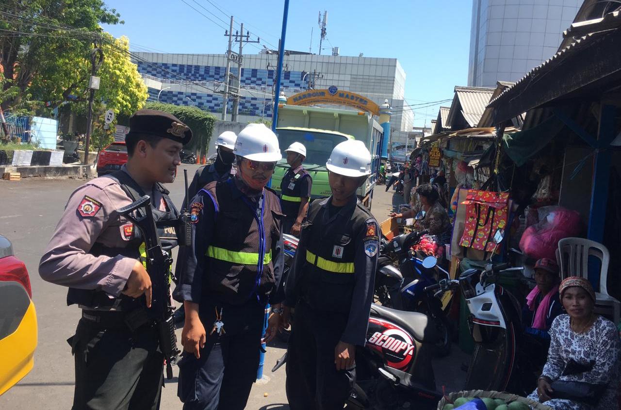 Seputarperak.com- Patroli bersama dilakukan personil Satsabhara Polres Pelabuhan Tanjung Perak dan sekuriti Pelindo di Pasar Ujung, Selasa pagi, 10 September 2019.