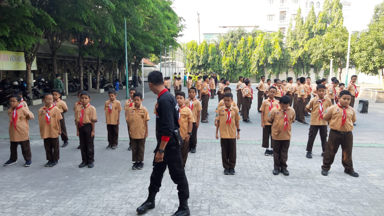 Seputarperak.com- Satsabhara Polres Pelabuhan Tanjung Perak memberikan pelatihan baris berbaris (PBB) kepada pelajar SD Al Irsyad di Jalan Sultan Iskandar Muda, Kecamatan Semampir, Sabtu pagi, 14 September 2019.