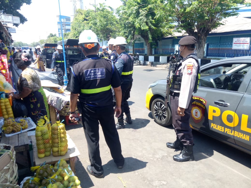 Seputarperak.com- Patroli bersama dilakukan personil Satsabhara Polres Pelabuhan Tanjung Perak dan sekuriti Pelindo di seputaran Pasar Ujung, Jumat siang, 4 Oktober 2019.