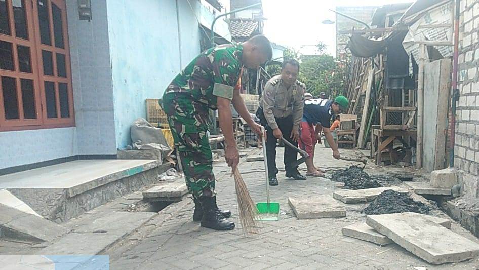 Dalam kesempatan itu, Aiptu Puji Sugiarto ikut membantu warga bekerja bakti bersama Sertu Suwardi, Babinsa Koramil Kenjeran.