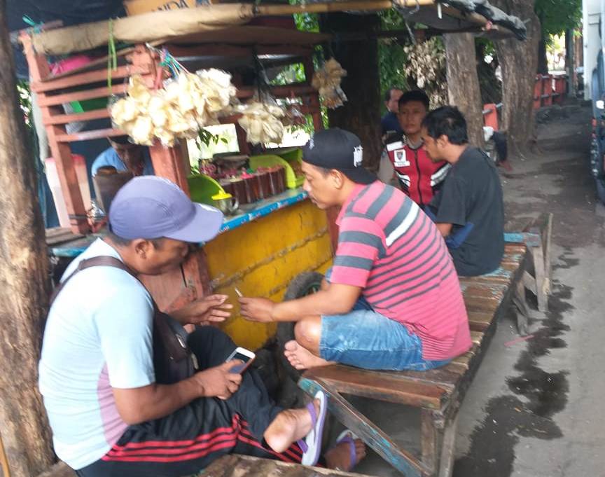 Seputarperak.com- Sosialisasi SPKT door to door disampaikan Aiptu Made Suarthana, Babinkamtibmas Bongkaran, Polsek Pabean Cantikan, Polres Pelabuhan Tanjung Perak kepada pengunjung warung milik Pak Muntohar di Jalan Semut Kali, Senin pagi, 2 Desember 2019.
