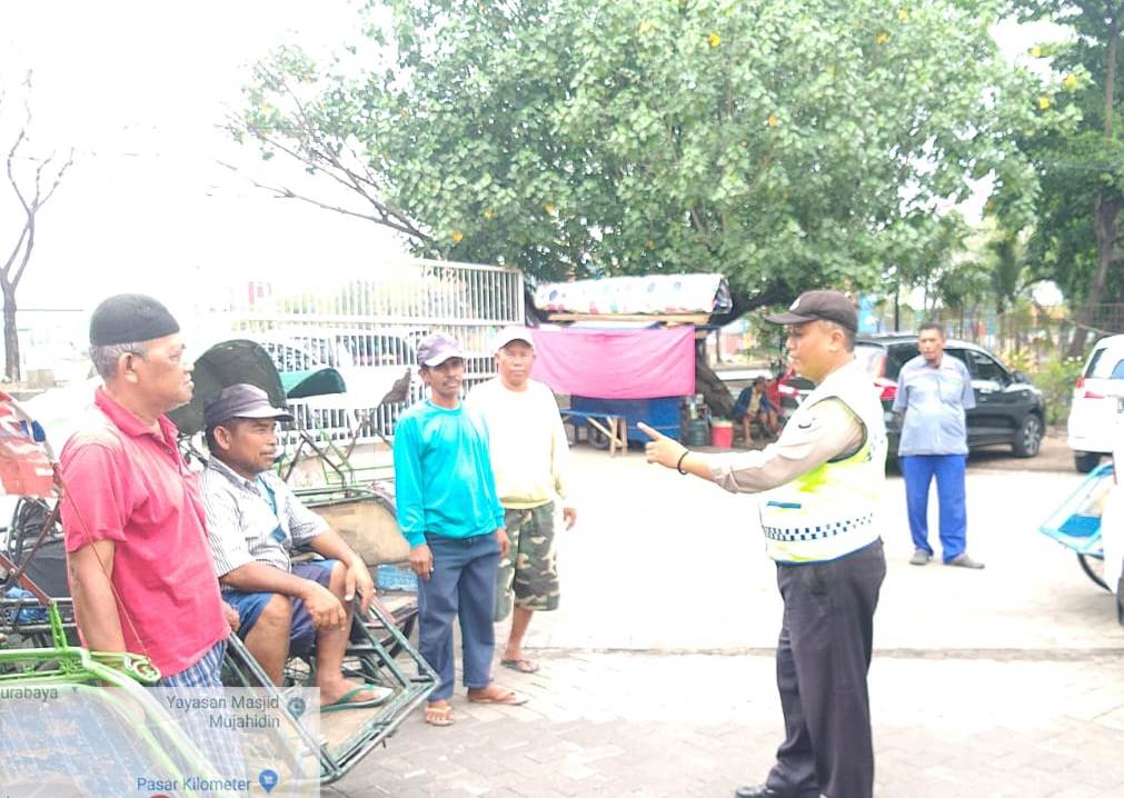 Seputarperak.com- Himbauan tertib berlalu lintas disampaikan Aiptu Heru Winarto, Babinkamtibmas Perak Utara, Polsek Pabean Cantikan, Polres Pelabuhan Tanjung Perak kepada sejumlah penarik becak di Jalan Laksda M Nasir.