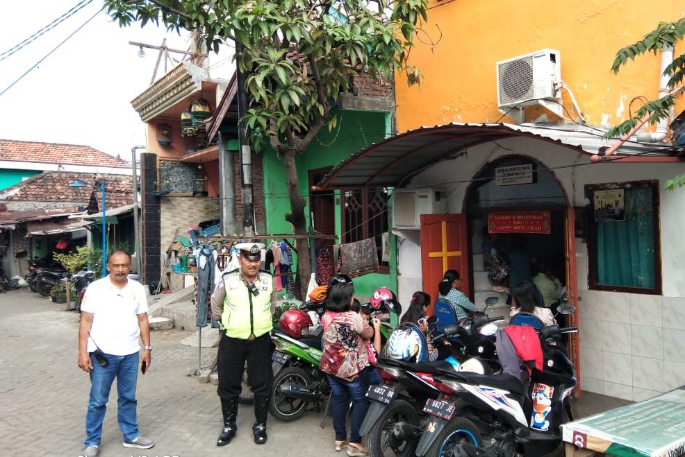 Seputarperak.com- Polsek Asemrowo, Polres Pelabuhan Tanjung Perak melaksanakan pengamanan kebaktian di dua gereja di wilayahnya, Minggu pagi, 29 Desember 2019.