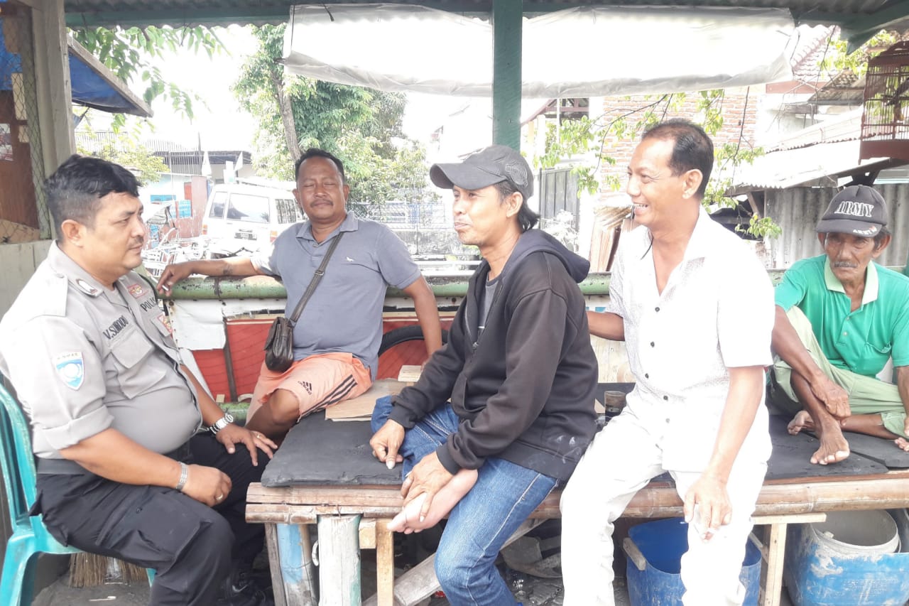 Seputarperak.com- Sosialisasi SPKT door to door disampaikan Bripka Victor Sumbodo, Babinkamtibmas Ujung, Polsek Semampir, Polres Pelabuhan Tanjung Perak kepada warga RT 05 RW 13 Jatipurwo, Selasa pagi, 31 Desember 2019.