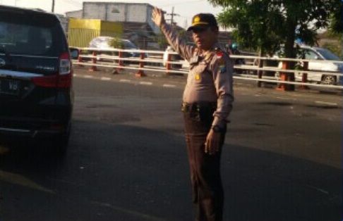 Arus lalu lintas yang padat kendaraan itu tak sampai terjadi macet setelah dilakukan pengaturan oleh personil Polsek Asemrowo.