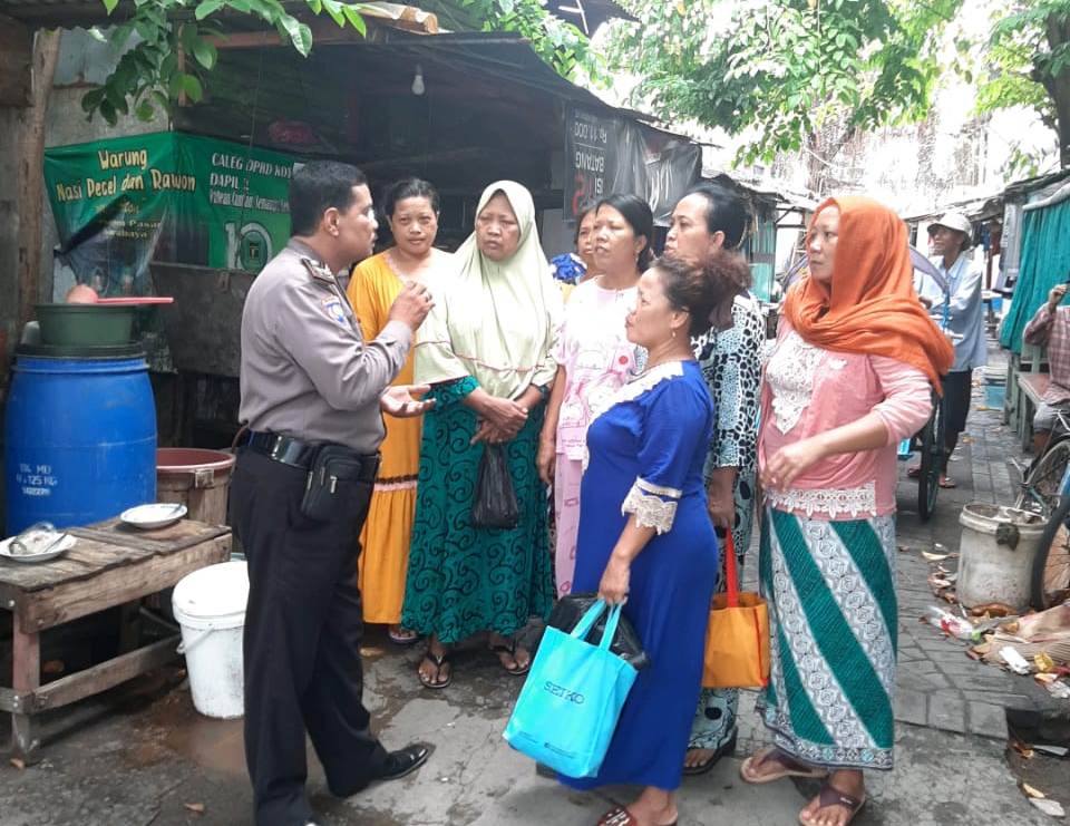 Seperti yang dilakukan Aiptu M Yasin, Babinkamtibmas Krembangan Utara, Polsek Pabean Cantikan saat menemui ibu-ibu warga Jalan Pesapen Pasar, Sabtu pagi, 8 Pebruari 2020.
