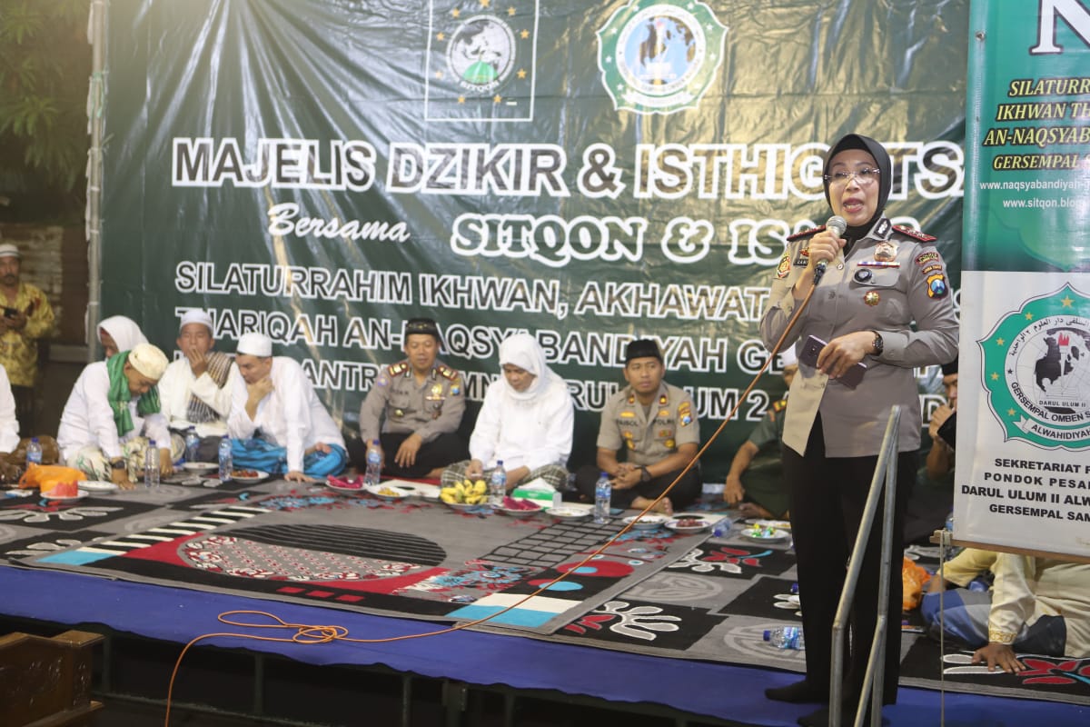 Seputarperak.com- Kapolres Pelabuhan Tanjung Perak, AKBP Ganis Setyaningrum, S.Si, MH ikut menghadiri dzikir dan istiqosah bersama majelis SITQON dan Is’Ad II Al Wahidiyah yang digelar di Jalan Wonokmusumo Tengah, Selasa malam, 11 Pebruari 2020.