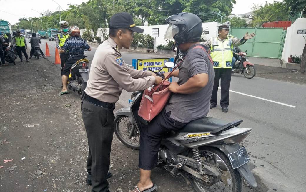 Semua pengendara sepeda motor yang melintas dihentikan dan dilakukan pemeriksaan surat-surat (SIM dan STNK) berikut penggeledahan barang bawaan.