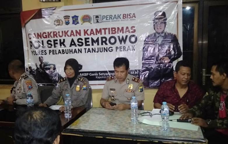 Seputarperak.com- Cangkrukan kamtibmas digelar Polsek Asemrowo, Polres Pelabuhan Tanjung Perak bersama warga Greges Timur gang I RT 02 RW 01 Kelurahan Tambak Sarioso, Senin malam, 9 Maret 2020.