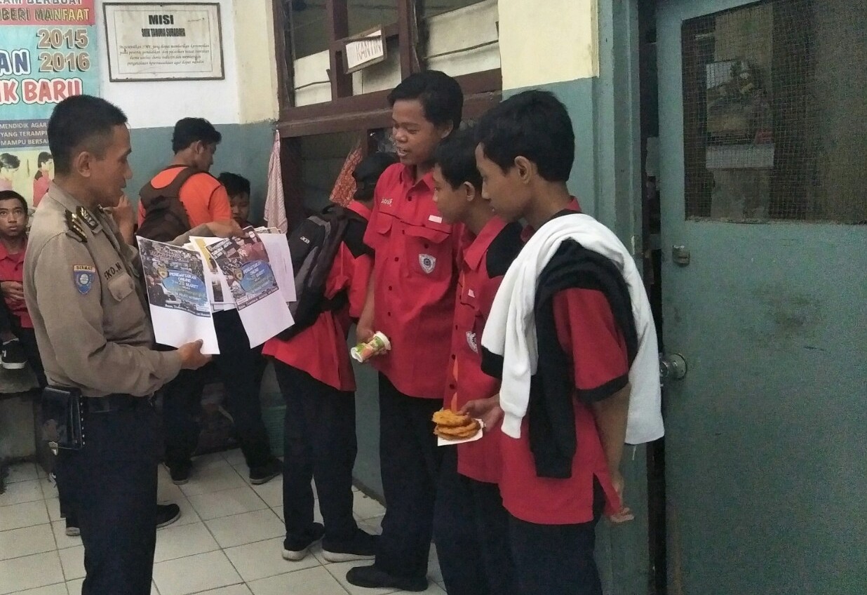 Seputarperak.com- Sosialisasi pendaftaran Polri disampaikan Ipda Eko Mustaghfirin, Panit Binmas Polsek Asemrowo, Polres Pelabuhan Tanjung Perak kepada para pelajar kelas 12 SMK Taruna, Jalan Asem Raya, Jumat pagi, 13 Maret 2020.