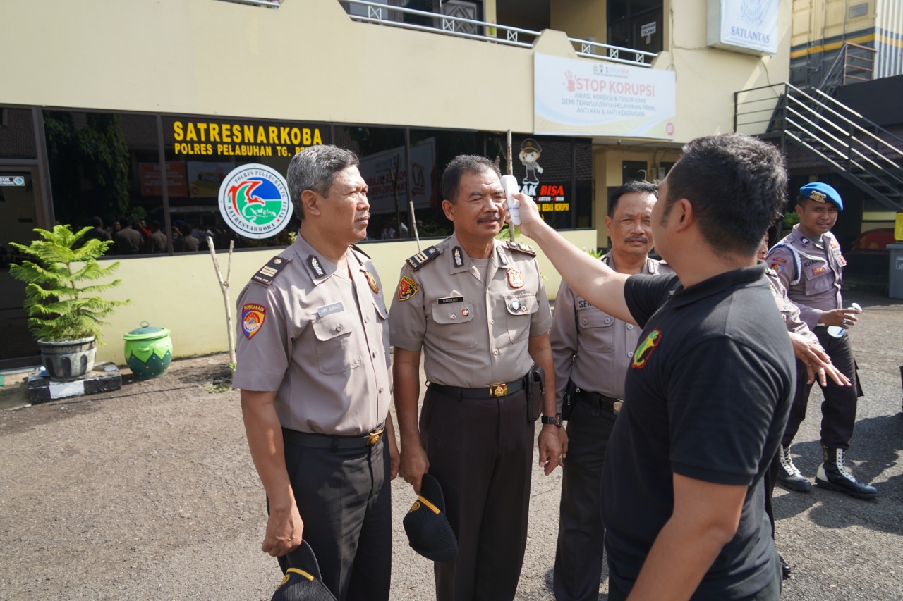 Seputarperak.com- Untuk mencegah penyebaran virus corona, Polres Pelabuhan Tanjung Perak melakukan pengecekan suhu tubuh para personil sekaligus memberikan cairan antiseptic, Senin pagi, 16 Maret 2020.