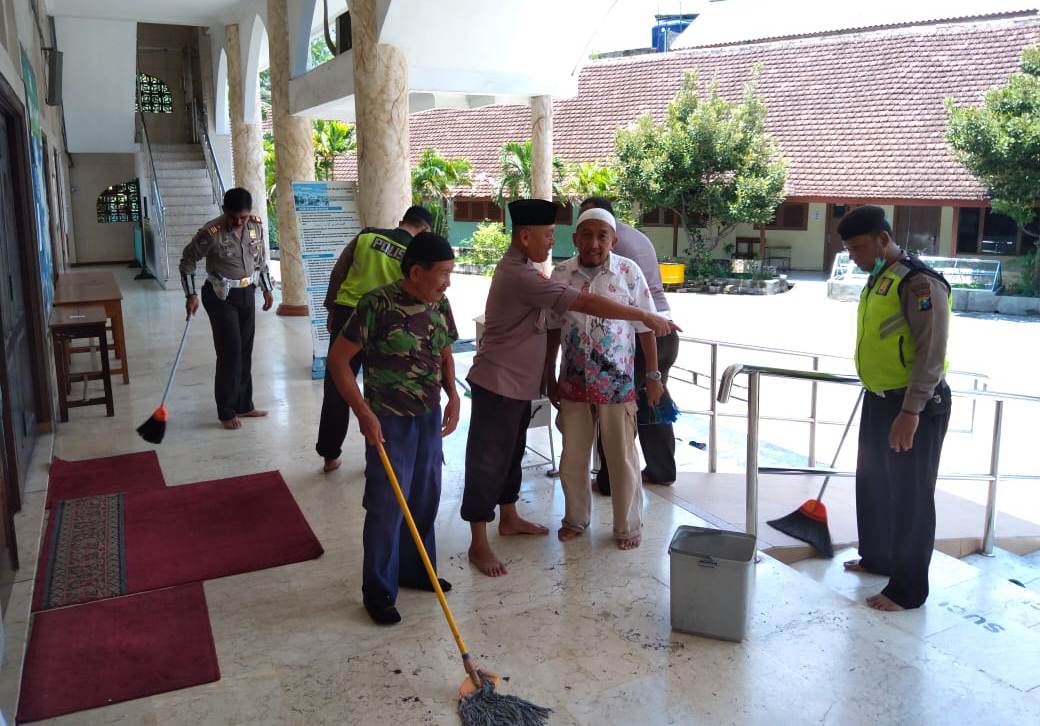 Seputarperak.com- Bakti sosial dilakukan personil Polsek Krembangan, Polres Pelabuhan Tanjung Perak dengan melakukan bersih-bersih dan penyemprotan antiseptic di Masjid Al Ikhlas Jalan Tanjung Sadari, Selasa siang, 17 Maret 2020.