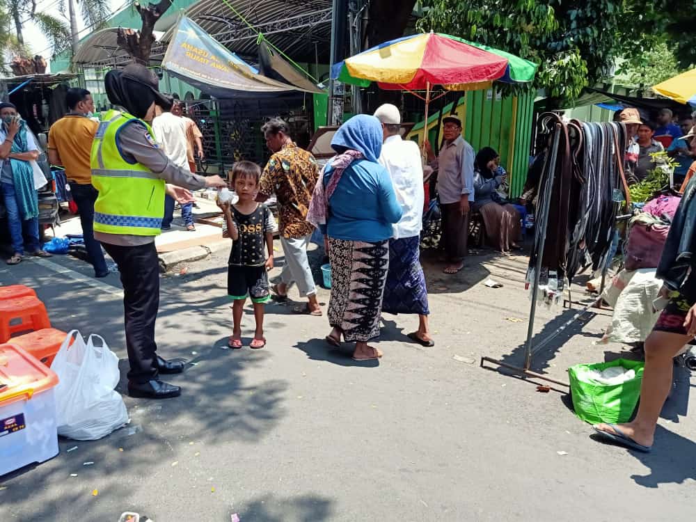 Saat itu personil Polwan juga memberikan sosialisasi jaga kebersihan untuk mencegah virus corona.