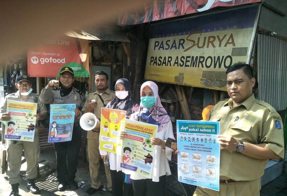 Seputarperak.com- Penyuluhan waspada virus corona atau Covid-19 disampaikan Ipda Eko Mustaghfirin, Panit Binmas Polsek Asemrowo, Polres Pelabuhan Tanjung Perak kepada pengunjung dan pedagang Pasar Asemrowo di Jalan Asem Raya, Senin pagi, 23 Maret 2020.