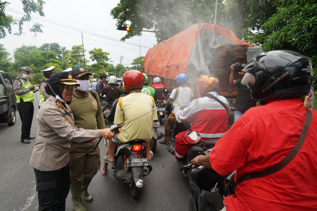 Pada kesempatan itu, AKBP Ganis juga ikut melakukan penyemprotan kepada semua kendaraan yang melintas. Termasuk sepeda motor.