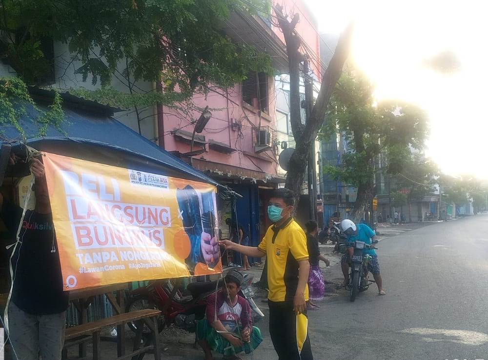 Dalam spanduk berwarna dasar kuning tersebut terulis seruan, ‘Beli Langsung Bungkus Tanpa Nongkrong’.