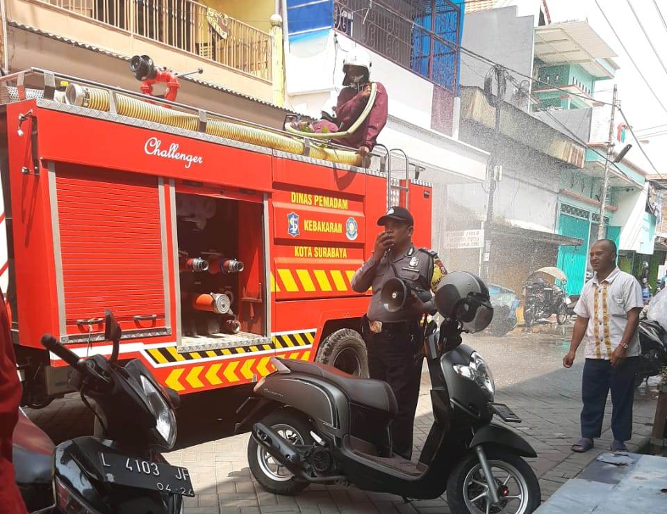 Seputarperak.com- Penyemprotan disinfektan dilakukan petugas pemadam kebakaran (Damkar) di Jalan Pasar Babaan, Kelurahan Krembangan Utara, Sabtu pagi, 4 April 2020.