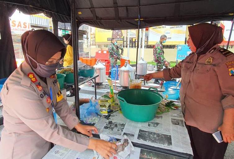 Seputarperak.com- Kapolres Pelabuhan Tanjung Perak, AKBP Ganis Setyaningrum, S.Si, MH memimpin langsung proses memasak makanan di dapur umum yang dibuat di jalan depan Mapolres, Rabu, 15 April 2020.