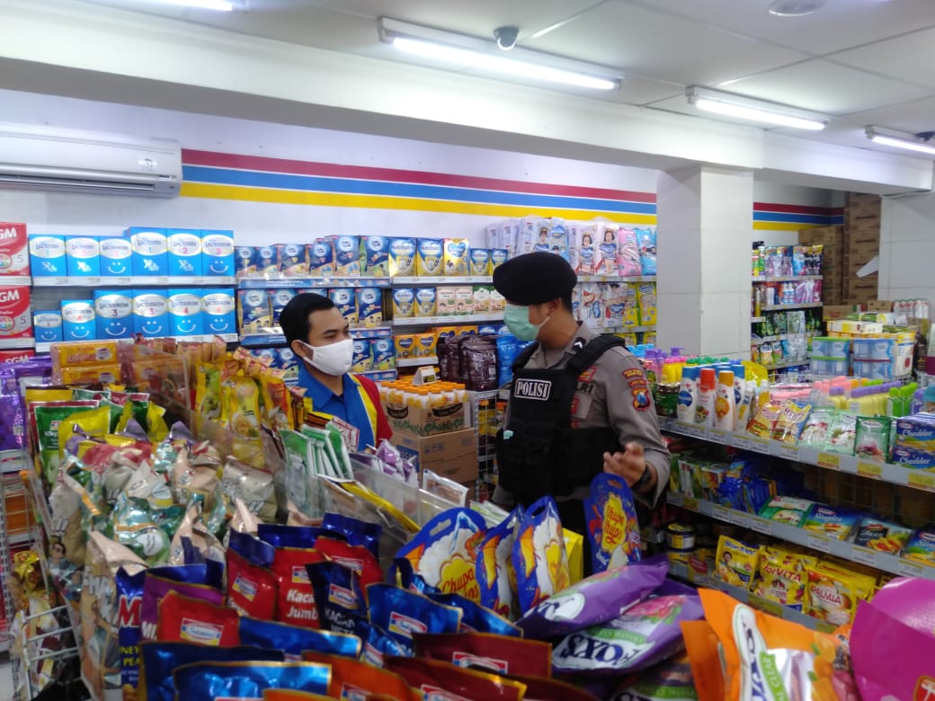 Seputarperak.com- Patroli dilakukan personil Satsabhara Polres Pelabuhan Tanjung Perak di mini market Indomart, Jalan Kebalen, Sabtu pagi, 18 April 2020.