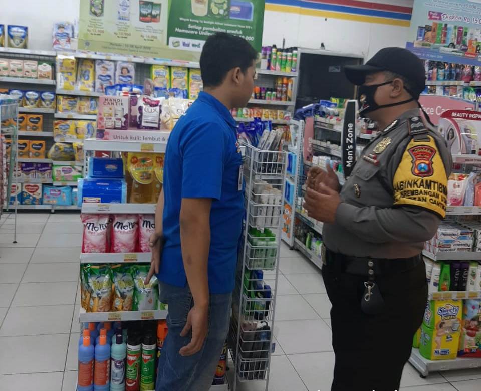 Seputarperak.com- Kegiatan patroli dilakukan Aiptu M Yasin, Babinkamtibmas Krembangan Utara, Polsek Pabean Cantikan, Polres Pelabuhan Tanjung Perak di mini market Indomart, Jalan Kebalen, Minggu malam, 19 April 2020.