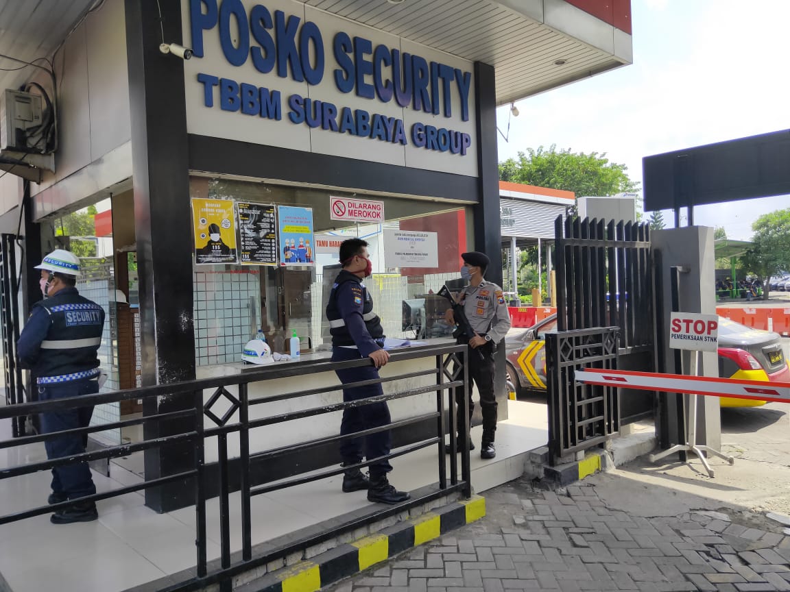 Seputarperak.com- Patroli dilakukan personil Satsabhara Polres Pelabuhan Tanjung Perak di obyek vital Depo Pertamina, Jalan Perak Barat, Jumat siang, 24 April 2020.