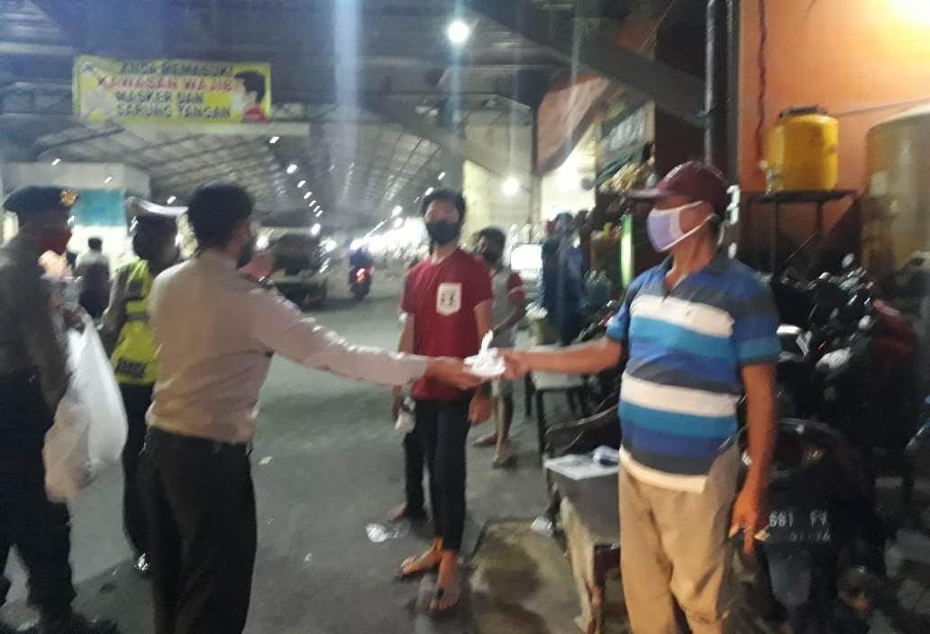 Seputarperak.com- Polsek Asemrowo, Polres Pelabuhan Tanjung Perak membagikan nasi bungkus untuk pedagang dan pengunjung Pasar Buah, Jalan Tanjungsari, Rabu dini hari, 29 April 2020.