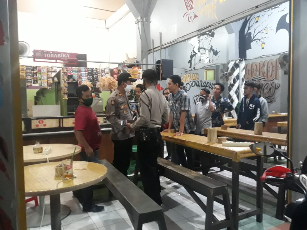 Seputarperak.com- Polsek Asemrowo, Polres Pelabuhan Tanjung Perak melaksanakan patroli di warung kopi (Warkop) untuk membubarkan kerumunan dalam rangka menegakkan aturan PSBB (Pembatasan Sosial Berskala Besar), Sabtu malam, 9 Mei 2020.