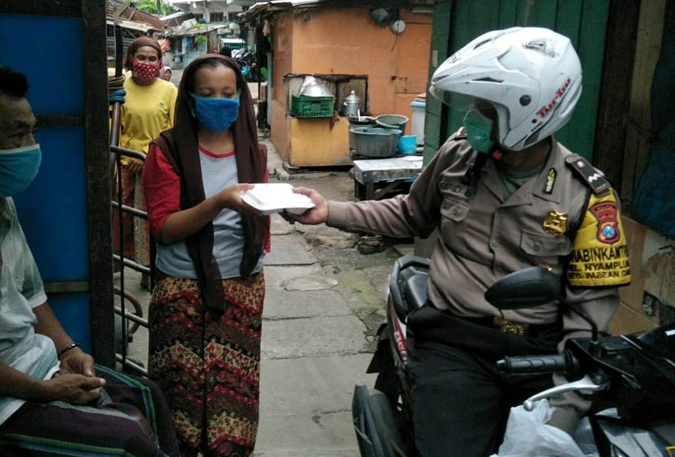 Seputarperak.com- Pembagian nasi kotak dilakukan Aipda Farid, Babinkamtibmas Nyamplungan, Polsek Pabean Cantikan, Polres Pelabuhan Tanjung Perak, Senin petang, 18 Mei 2020.