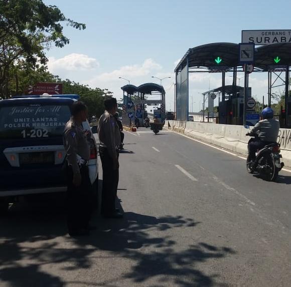 Personil Unit Lantas yang bertugas saat itu terus mengawasi setiap kendaraan yang lewat, untuk mencari tahu kemungkinan kendaraan hasil curian yang akan dibawa masuk wilayah Madura, melewati gerbang Tol Suramadu.