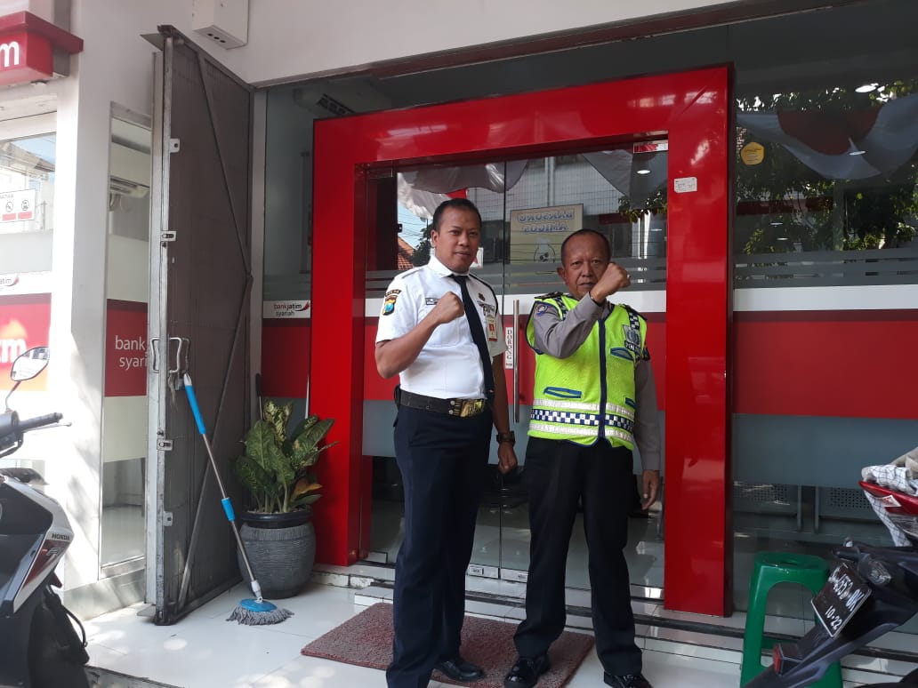 Setelah memastikan situasi aman dan kondusif, serta tidak ada tanda-tanda tindak kriminalitas yang terjadi, Aiptu Buaman menemui petugas sekuriti Bank Jatim, untuk menyampaikan himbauan kamtibmas.