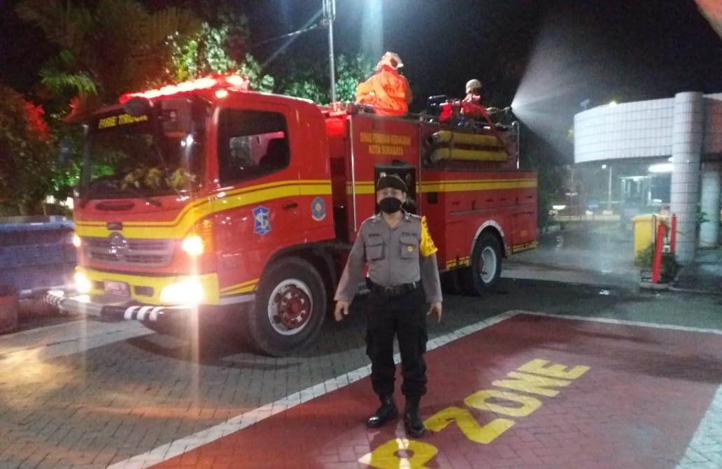 Seputarperak.com- Penyemprotan disinfektan dilakukan anggota pemadam kebakaran (Damkar) Pemkot Surabaya di halaman Stasiun Surabaya Kota, Jumat malam, 29 Mei 20-2020.