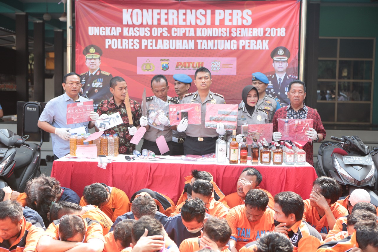 Seputarperak.com- Operasi cipta kondisi (Cipkon) yang digelar Polres Pelabuhan Tanjung Perak dan Polsek jajaran sepanjang Bulan Juli 2018 hingga Agustus 2018, berhasil mengamankan ratusan tersangka dan barang bukti.