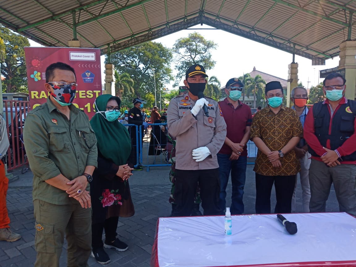 Seputarperak.com- Kapolsek Semampir, Polres Pelabuhan Tanjung Perak, Kompol Aryanto Agus memimpin pengamanan kegiatan rapid test yang digelar di halaman parkir bus Wisata Religi Ampel, Jumat pagi, 5 Mei 2020.