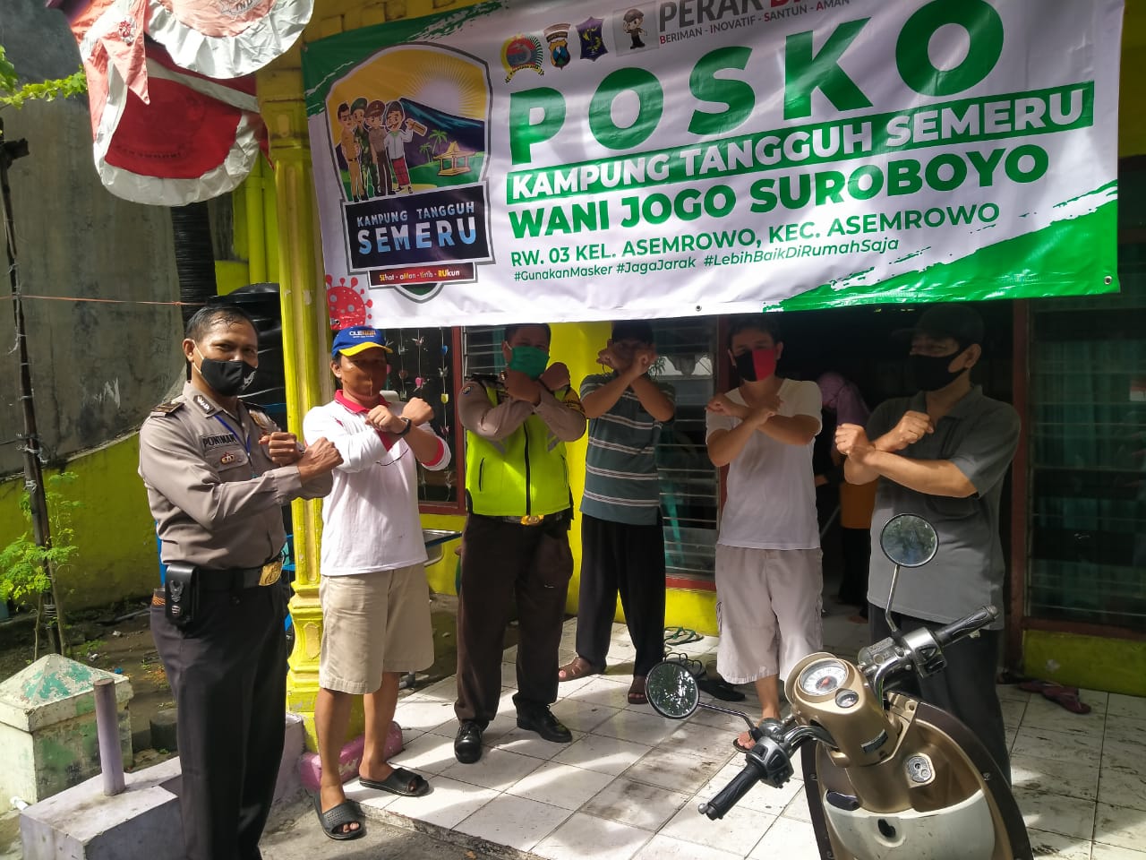 Seputarperak.com- Himbauan penerapan protokol kesehatan pencegahan Covid-19 disampaikan Ipda Poniman, Panit Binmas Polsek Asemrowo, Polres Pelabuhan Tanjung Perak kepada anggota tim Kampung Tangguh Semeru Wani Jogo Suroboyo RW 03 Kelurahan Asemrowo.