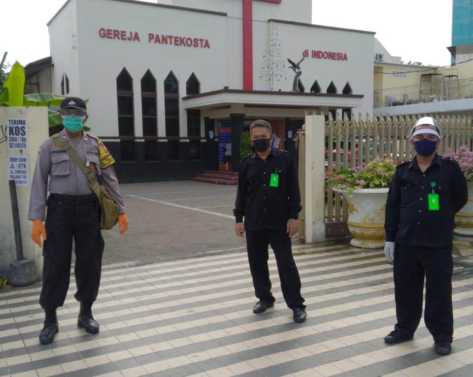 Seputarperak.com- Pengamanan kebaktian di Gereja Pantekosta, Jalan Rajawali dilakukan Aiptu Marijono, Babinkamtibmas Perak Timur, Polsek Pabean Cantikan, Polres Pelabuhan Tanjung Perak, Minggu pagi, 21 Juni 2020.