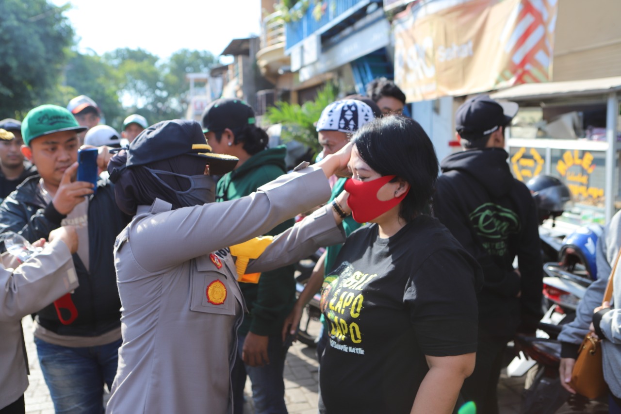 Seputarperak.com- Kapolres Pelabuhan Tanjung Perak, AKBP Ganis Setyaningrum, S.Si, MH membagikan masker gratis kepada komunitas Bonek, Selasa, 30 Juni 2020.