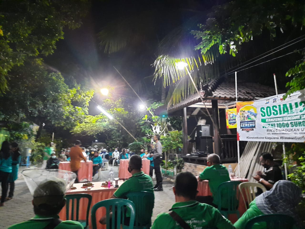 Seputarperak.com- Sosialisasi penerapan protokol kesehatan pencegahan Covid-19 disampaikan Kanit Binmas Polsek Krembangan, Polres Pelabuhan Tanjung Perak di RT 11 RW 05 Kelurahan Morokrembangan, Minggu malam, 5 Juli 2020.