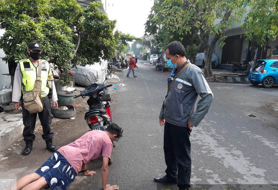 Seputarperak.com- Sanksi disiplin diberikan kepada warga Kelurahan Perak Barat yang kedapatan tidak menggunakan masker di luar rumah, Selasa pagi, 7 Juli 2020.