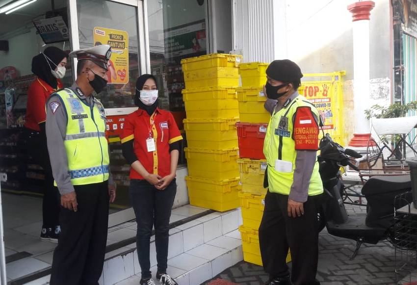 Seputarperak.com- Personil Polsek Pabean Cantikan, Polres Pelabuhan Tanjung Perak menggelar kegiatan patroli di mini market Alfamidi, Jalan Waspada, Minggu siang, 12 Juli 2020.