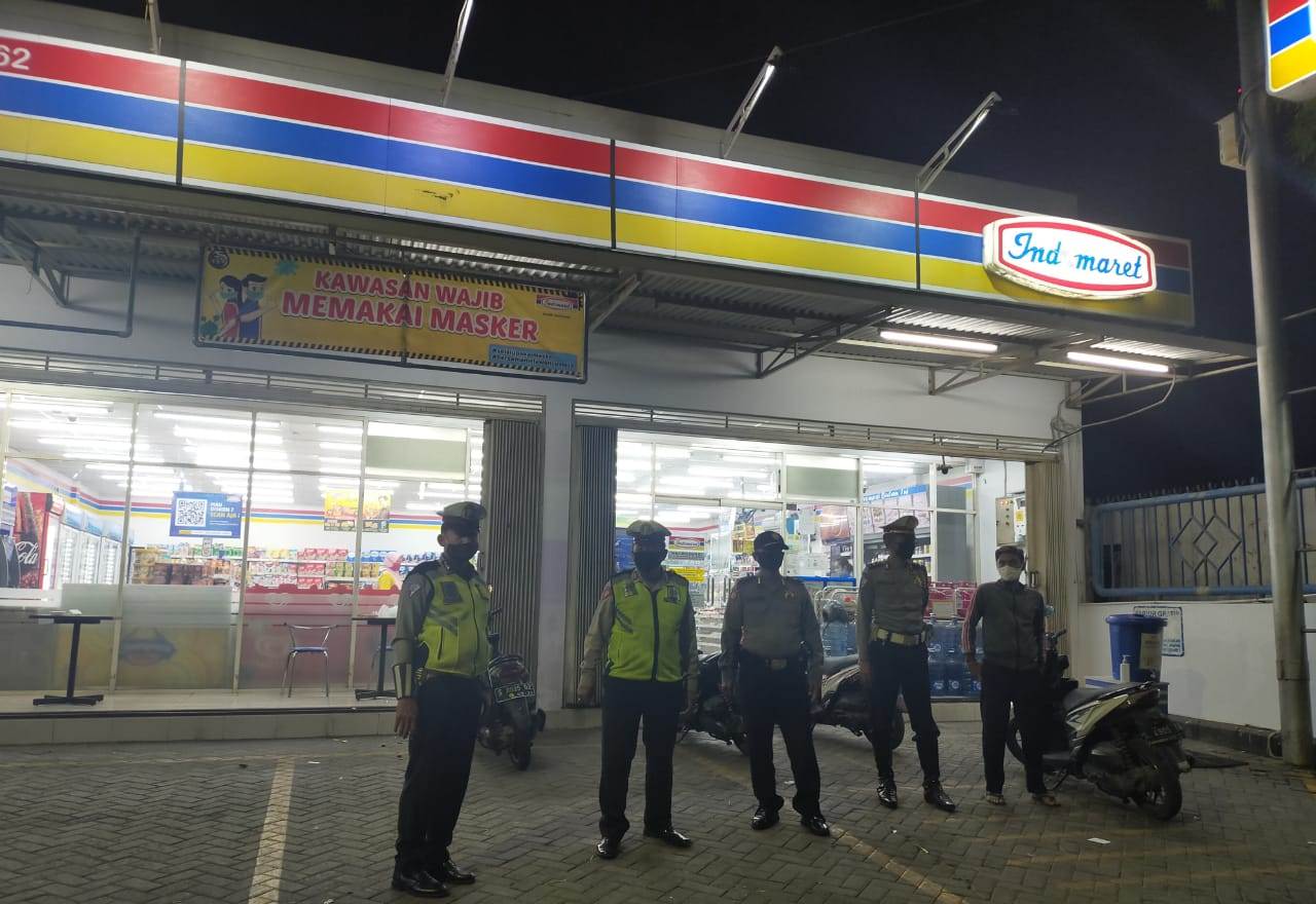 Seputarperak.com- Patroli dilakukan personil Polsek Asemrowo, Polres Pelabuhan Tanjung Perak di mini market Indomart, Jalan Tanjungsari, Minggu malam, 12 Juli 2020.