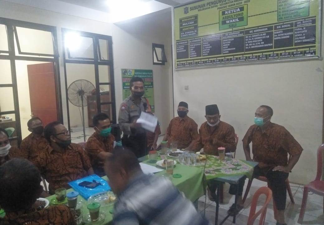 Seputarperak.com- Sosialisasi protokol kesehatan pencegahan Covid-19 disampaikan Ipda Eko Mustaghfirin, Panit Binmas Polsek Krembangan, Polres Pelabuhan Tanjung Perak di Balai RW 04 Kelurahan Dupak, Senin malam, 13 Juli 2020.