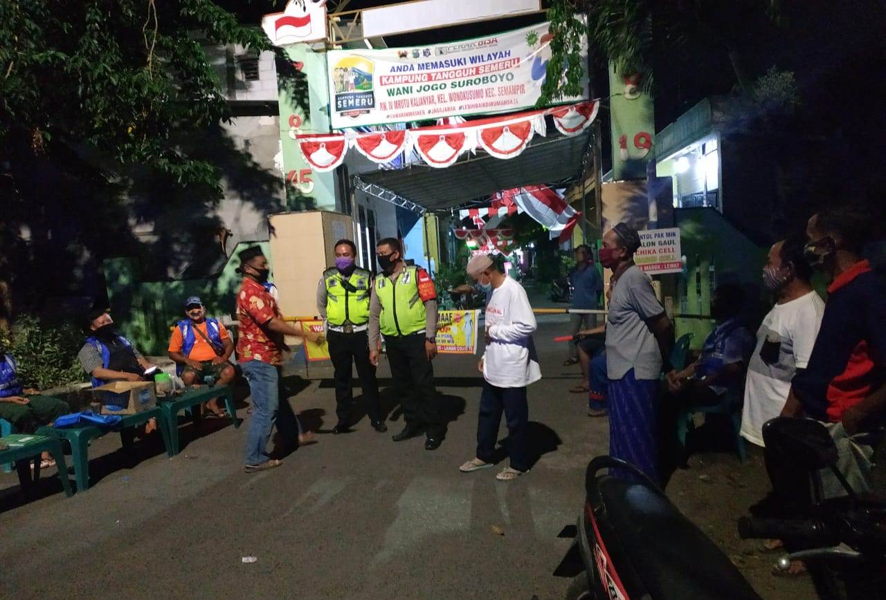Seputarperak.com- Personil Polsek Semampir, Polres Pelabuhan Tanjung Perak melaksanakan kegiatan patroli malam di pemukiman Kampung Tangguh Semeru RW 04 Jalan Mrutu Kalianyar, Kelurahan Wonokusumo, Senin malam, 20 Juli 2020.