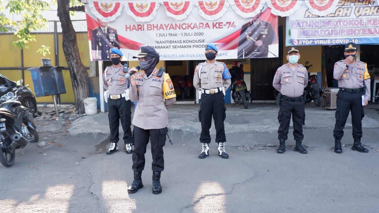 Seputarperak.com- Kapolres Pelabuhan Tanjung Perak, AKBP Ganis Setyaningrum, S.Si, MH memimpin apel persiapan pengamanan jalur unjuk rasa karyawan di Pos Polisi Jalan Margomulyo, Selasa pagi, 28 Juli 2020.