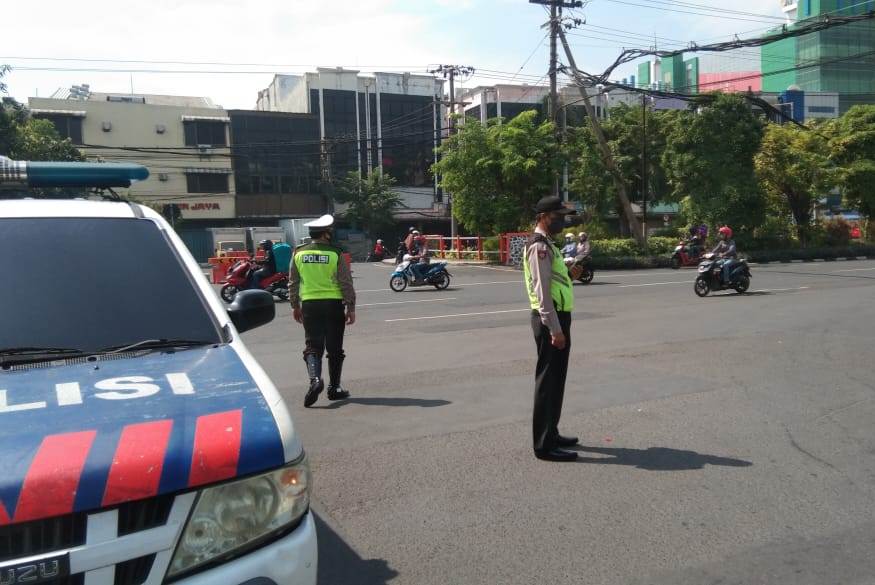 Seputarperak.com- Pengaturan lalu lintas dilakukan personil Unit Lantas dan Unit Sabhara Polsek Pabean Cantikan, Polres Pelabuhan Tanjung Perak di seputaran Jalan Bunguran, Selasa sore, 28 Juli 2020.